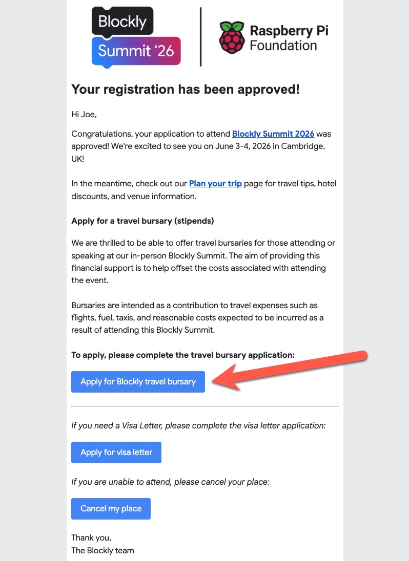 Check your inbox for the approval email from support@blockly.com to locate your 'Apply for Blockly travel bursary' unique link.